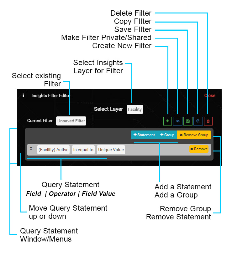 Statement: the light gray window is used to construct a Statement and includes selecting a Field – Operator – Field Value. Select the text in each cell to open the corresponding menu. The ‘x Remove’ button removes the corresponding  Statement.