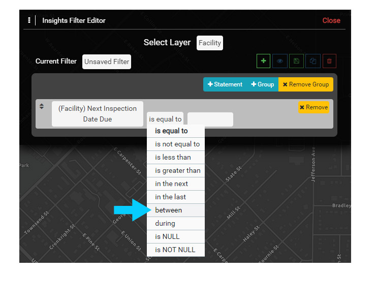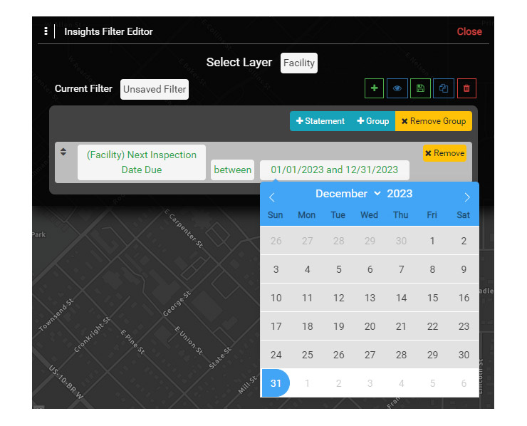 3. In the Statement area, select the Field (Facility) to add a Field to the Statement. Use the Search area to enter ‘date’ to help find Fields with the text ‘date’ in the name, then select Next Inspection Date Due. This will be the Field used for this Filter.