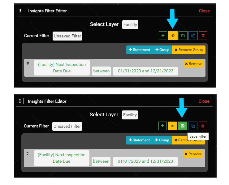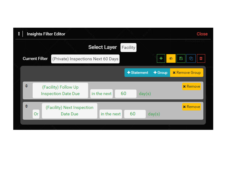 Insight Filters provide a way to segment information for a Report or Visualization. For example, a Report might include a Filter that finds all Restaurants that have an Inspection due in the next 60 days. Note that the Filter could also be applied to a Visualization to see the matching Restaurants on the map.