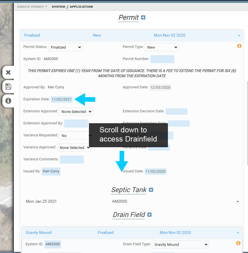 Note that you can also scroll down in the Permit accordion to gain access to the Septic Tank and Drainfield associated with this Permit. You could edit information for each component using this approach even if the Septic Tank and/or Drainfield were mapped.