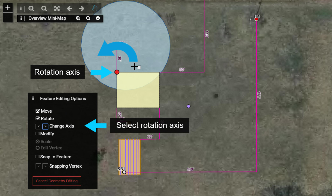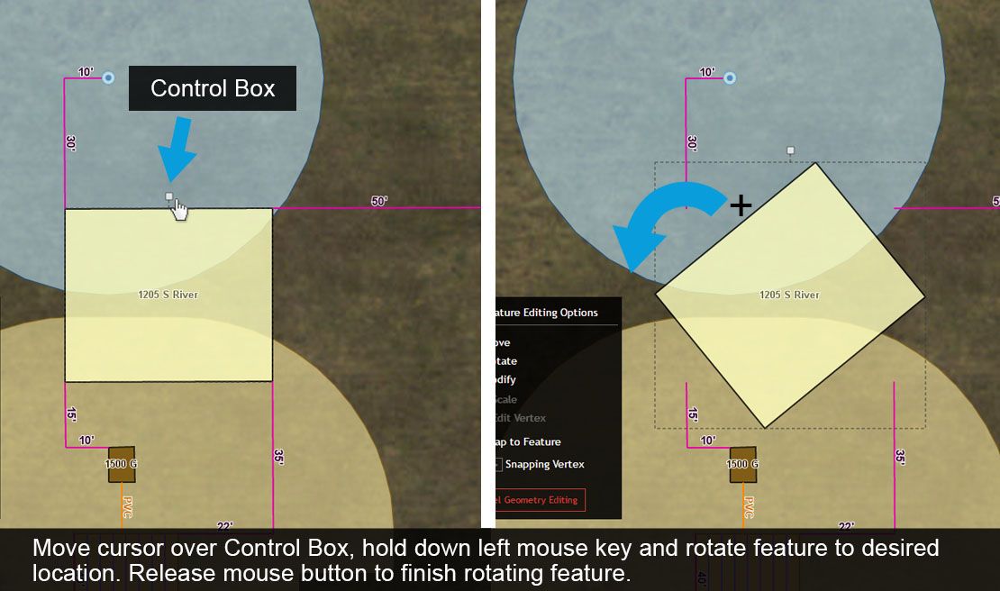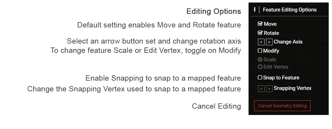 The ‘Feature Editing Options’ menu provides options for performing edits to a mapped feature. By default, the ‘Move’ and ‘Rotate’ options are enabled. Toggle on ‘Modify’ to ‘Scale’ a feature or ‘Edit Vertex’ of a featur