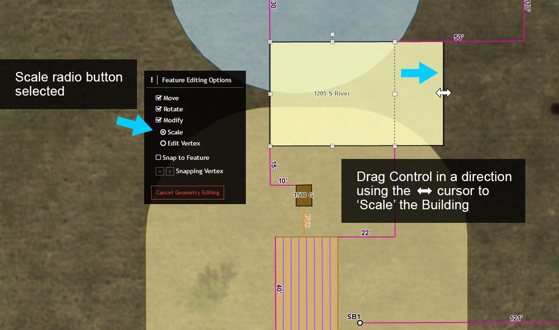 Note that scaling a feature works best when the feature is at a true North/South or East/West angle.