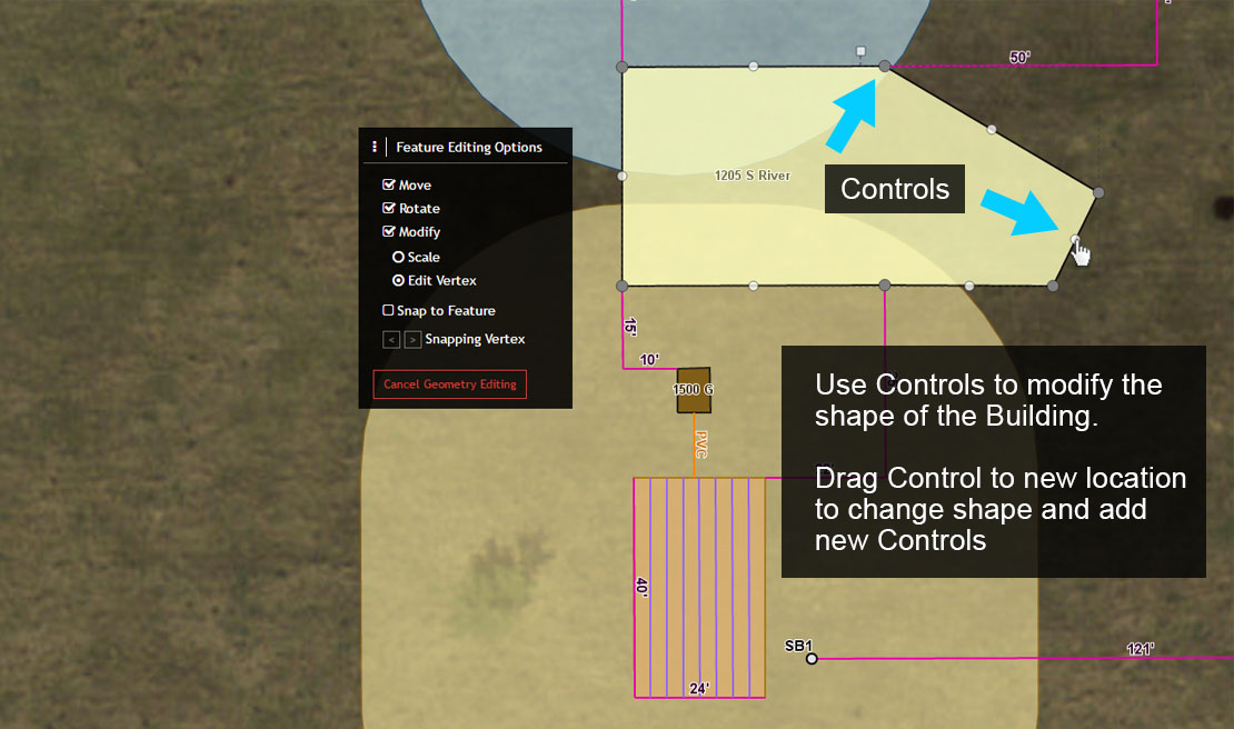 IMPORTANT: a feature edit, like moving a feature, is not saved until the ‘Apply’ button is selected. If you do not want to commit an edit, select ‘Cancel Geometry Editing’ on the Feature Editing Options menu.