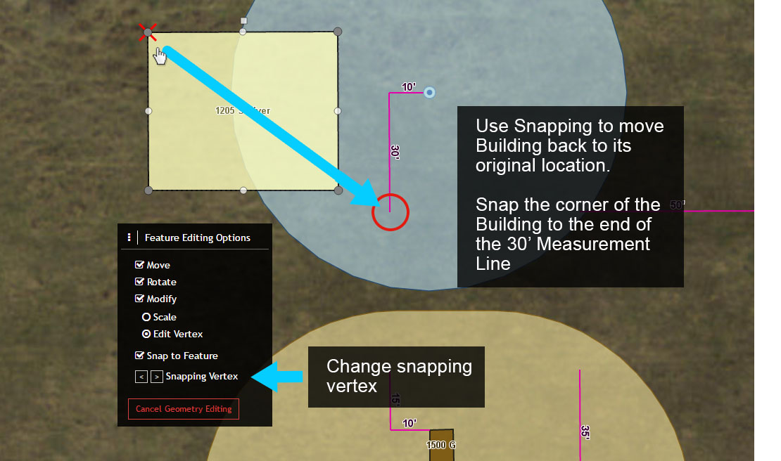 Notice the red X that appears on the northwest corner of the Building. This represents the vertex on the Building that will be used to ‘snap’ to another mapped feature, in this instance the 30′ Measurement Line.