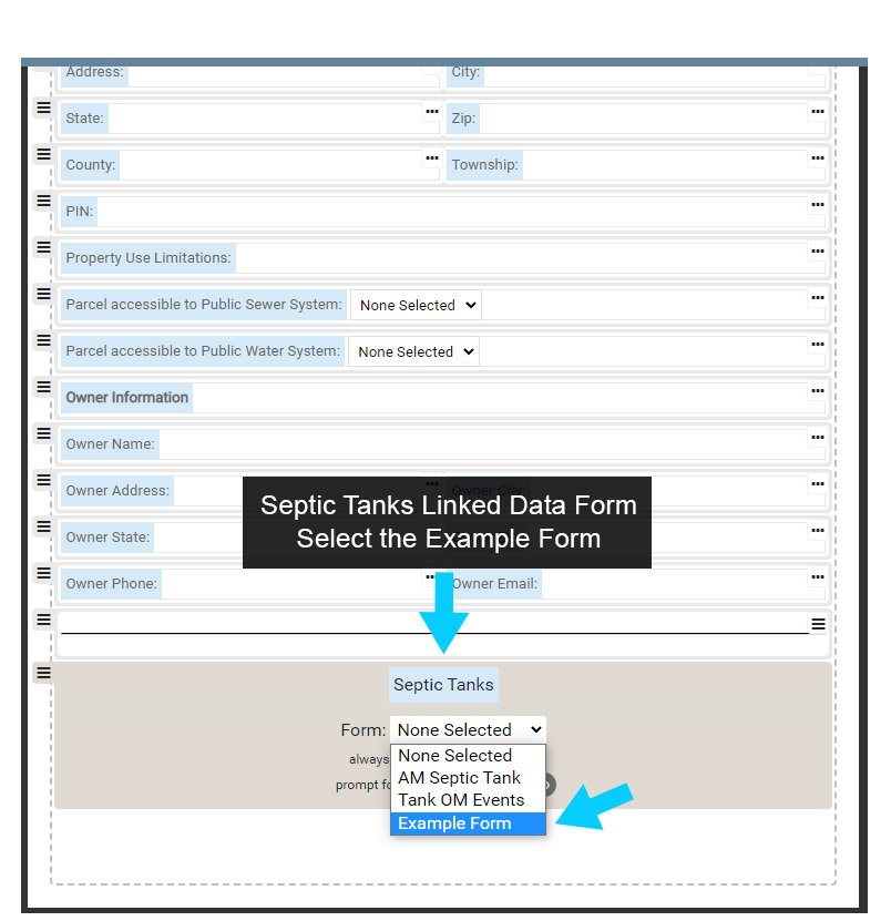 Using the Form drop down menu located under the text Septic Tanks, select Example Form from the drop down menu. This will set the Linked Data Form Septic Tanks to the Example Form.