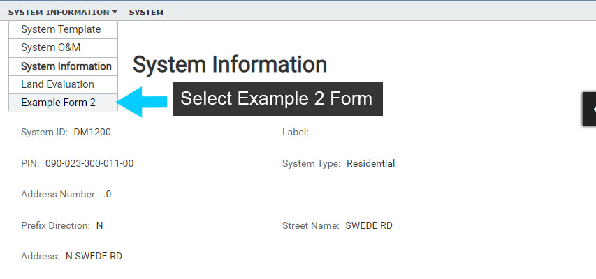 In the Form drop down menu select Example Form 2. Then scroll down to see that the Example Form you created for Septic Tanks is also displayed.