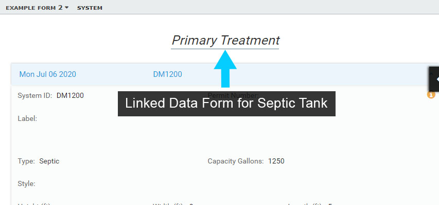 A Linked Data Form is a Form Element that is embedded in another Form. For example, a System Form can include Linked Data Forms for an Application, Permit, Site Evaluation, Septic Tank, Drain Field, Soil Boring and Building.