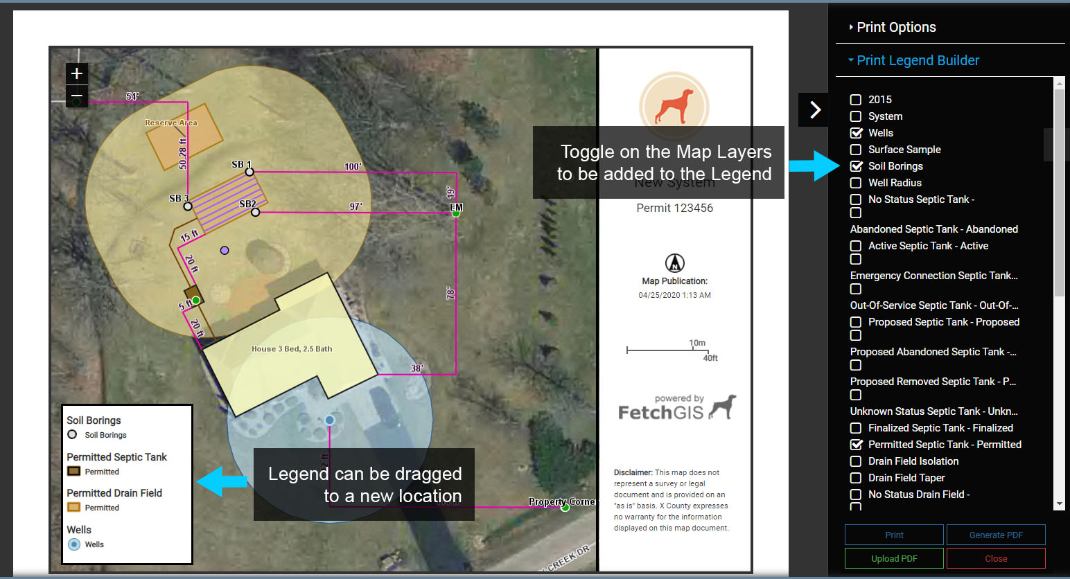 2. Select the ‘Print Legend Builder to add a Legend to the Map. Toggle on Map Layers that will be added to the Legend and the Legend will automatically be constructed on the map. Note that the Legend can be moved to a new location by dragging it with the cursor.