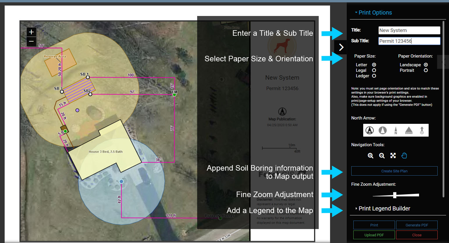 The Print button on the Main Menu is used primarily to generate map output, such as Site Plans or other maps. When generating Site Plans, the Print menu provides an option to ‘Create Site Plan’, which adds Soil Boring information to the second page of the output.