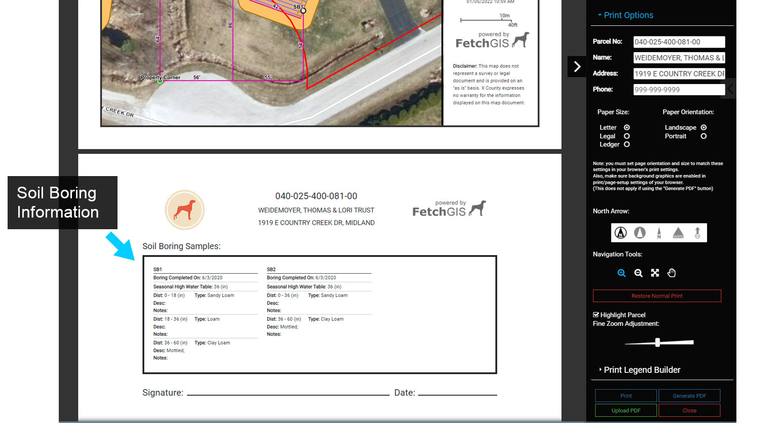 Note that a Site Plan PDF or print is two (2) pages, with the second page containing the Soil Boring information.